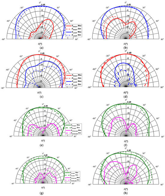 Figure 4 shows, for the different operating states of the designed antenna, the variation of the simulated electric field along the patch, for four fixed moments during a period T. For example, for the CP1 state it is possible to see that for the instant t = 0 s, the feeding signal at the vertical point (bottom side of the patch) has a value close to zero, while at the horizontal point (right side of the patch) the feeding signal has a high value, and the field distribution (instantaneously) resembles the TM01 mode. After a quarter of the period t = T/4 s the instantaneous situation is the opposite, that is, the feeding signal at the vertical point presents a maximum while at the horizontal point it presents a minimum, and in this case the instantaneous image of the distribution of the electric field resembles TM10 mode. It should be noted that in the case of states CP1 and CP2, the antenna feed signals are out of phase by T/4 s from each other to enable the generation of circular polarization.