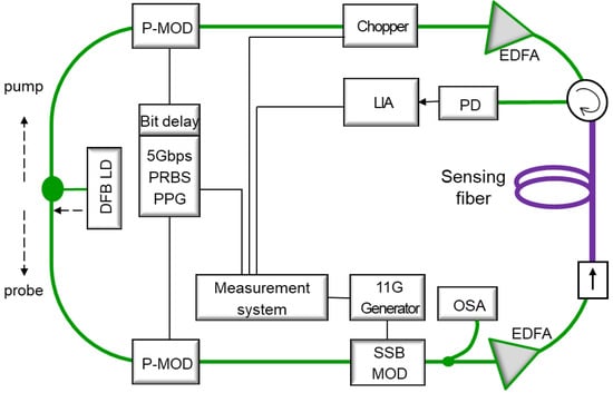 The experimental setup for the TD-BOCDA sensor measurement system is shown in Figure 1. A continuous lightwave from a distributed feedback (DFB) laser diode was split by a 3 dB coupler into two opposite directions as the probe and pump lightwaves. They were optically modulated by their respective phase modulators, which were driven by 216-1 bits of PRBS from a pulse pattern generator (PPG) of 5 Gbps. The bit length of the 216-1 PRBS code was 65535, which could accommodate up to 1310 m of the sensing optical fiber with a spatial resolution of 2 cm. The same PRBS codes were applied to the two modulators; however, they had a bit delay relation []. After the phase modulation, the probe was again modulated by a single-sideband (SSB) modulator, which caused the carrier frequency to downshift from the pump lightwave by ~11 GHz. The SBS in the sensing optical fiber was generated by the frequency difference between the probe and pump lightwaves. After amplification using an Er-doped fiber amplifier (EDFA), the probe was introduced into the sensing fiber through an optical isolator. The pump sequentially passed through a phase modulator driven by PRBS codes and an optical chopper modulated by a sine wave of approximately 3 MHz. A chopper was required for the LIA to be used for optical signal detection. After chopping, the pump was amplified by a high-power EDFA of 27 dBm and inserted into a sensing fiber through an optical circulator. The circulator and isolator positioned at both ends of the sensing optical fiber prevented the lightwaves from propagating further and restricted the occurrence of the SBS effect to only the sensing optical fiber. After the isolator, the probe was amplified on the sensing fiber by the pump traveling in the opposite direction of the fiber and then received by the detector through the circulator. Figure 1 also shows the connection of the measurement control system, where the PPG, bit delay, SSB modulation, pump-chopping, and LIA are interconnected and controlled together, resulting in the collection of SBS.