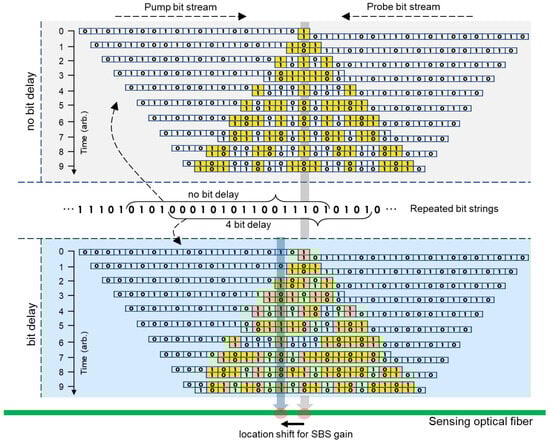 The operating principle of TD-BOCDA is conceptually illustrated in Figure 2, which explains how the location on the sensing fiber where the SBS gain is measured is determined in this measurement system. The long line at the bottom indicates the sensing fiber. On top of this, the time-dependent interaction between the two optical signals is shown separately for the case with no bit delay between the two signals and the case with a 4-bit delay. First, let us consider the case with no bit delay. Two optical signals, the pump and probe, phase-modulated by 0 and 1, are depicted traversing the sensing fiber in opposite directions. The signals consist of 20 bits each for the sake of the example, and because they were generated by the same PRBS generator, they have mirror-symmetric bit strings. They first meet at the midpoint of the sensing fiber, which is at the same distance from both modulators. The moment when the first bit overlaps is denoted as t = 0 in the figure. As time passes, the signals increasingly overlap, and the phases of the two overlapping signals may or may not match. However, there is only one location on the fiber where the two bits are always in phase, irrespective of time. (The experimental condition for this is that the bit stream must be longer than the length of the fiber, which is why a stream length of 216-1 was used in the experiment.) This location is at the same distance from both modulators, where the two optical signals are always in phase, thus maintaining the correlation between the two signals and resulting in an SBS gain. Outside this location, it is possible for the two signals to match in phase for a short period; however, they cannot remain in phase long enough to generate an SBS gain. (Bits with matching phases are distinguished in different colors, as shown in Figure 2.) Therefore, the SBS always occurs at a specific location on the sensing fiber, and the spatial length of this location is the minimum measurement interval corresponding to a time length of one bit. This is called the spatial resolution of the measurement system. An optical signal modulated at 5 Gbps provides a spatial resolution of 2 cm.