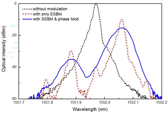 The optical spectra of the probe lightwaves are shown in Figure 3. The lightwaves were measured using a 1% tap after passing through the SSB modulator; this measurement point was marked as an optical spectrum analyzer (OSA), as shown in Figure 1. The spectrum without both phase modulation and SSB modulation is represented by a dotted line with a peak wavelength of 1551.97 nm. When SSB modulation was applied, the spectrum changed, as indicated by the dashed red line. The center wavelength of the 1551.97 nm was completely suppressed, and the peak wavelength shifted by 0.09 nm (11 GHz) to 1552.06 nm. The side-mode suppression ratio of this spectrum exceeded 20 dB. A wavelength difference between the probe with SSB modulation and the pump without SSB modulation was required to induce the SBS effect in the sensing fiber. The spectrum changed again when phase modulation was applied in conjunction with SSB modulation. This is indicated by the solid blue line in the figure, which clearly demonstrates the linewidth broadening of the spectrum owing to the modulation chirping of the 5 Gbps PRBS code.