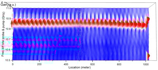The TD-BOCDA sensor system was applied to a standard optical single-mode fiber (SMF) with a length of 1 km as the sensing fiber. Figure 4 shows the three-dimensional Brillouin gain spectra measured at all the locations. At each measurement location, the frequency difference between the pump and probe was swept between 10.5 and 11 GHz with a resolution of 0.1 MHz, and the Brillouin gain spectrum was measured. The peak frequency difference for the highest gain at each fiber location, known as the Brillouin frequency, was determined from this spectrum. Each optical fiber possesses an inherent Brillouin frequency, whose value shifts with changes in strain or temperature. For example, the Brillouin frequencies of an SMF and a dispersion-shifted fiber (DSF) are around 10.8 GHz and 10.5 GHz, respectively []. To evaluate the accuracy of the 2 cm spatial resolution over a 1 km SMF, a 2 cm length of DSF was spliced at the exit end of a 1 km long SMF toward the pump input. Almost all the Brillouin frequencies of the SMF occurred near 10.85 GHz. However, the Brillouin frequency shifted slightly toward shorter wavelengths with increasing distance, owing to the position-dependent tension that occurs while winding a kilometer-long fiber spool. It is evident that there was a single Brillouin frequency peak of 10.53 GHz for the 2 cm DSF at the 1 km location. The Brillouin frequency shifts at the initial and final locations were distinctly measured and differed from the Brillouin frequencies measured at the most intermediate locations. These shifts were due to the different types of SMFs used.