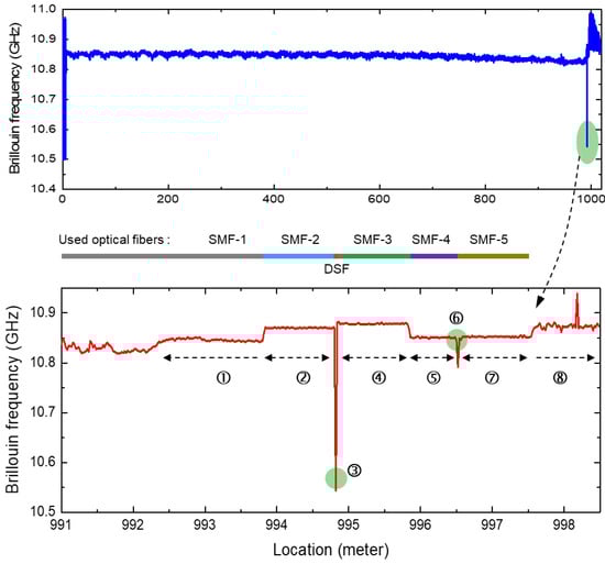 Figure 5 presents the Brillouin frequencies extracted from the gain spectra in Figure 4. Extracting the precise Brillouin frequency from this spectrum is critical to the accuracy of this measurement system. Both hardware approaches employing a probe or pump with multiple frequencies and software approaches involving the mathematical curve fitting of the extracted spectrum have been applied to enhance the accuracy []. In this paper, to clearly demonstrate the advantages of the proposed method, curve fitting was not applied. For reference, spectral measurements in BOCDA systems have been performed by our research group over the years under various conditions, and Lorentzian and Gaussian curve fittings have been applied. Depending on the shape of the spectrum, in some cases, the fitting caused more errors in the frequency compared to peak extraction; in other cases, it made no difference. The top graph in Figure 5 shows that almost all the Brillouin frequencies were approximately 10.85 GHz because of the one-type SMF with a length of 1 km. Both end regions exhibited significant frequency fluctuations, which were attributed to noise measured in the area outside the sensing fiber. At the end of the 1 km distance, a discrete location is marked with a green ellipse, which indicates a frequency of 10.53 GHz. This corresponded to the location of a 2 cm long DSF, and among the 51,000 measurement points measured with a spatial resolution of 2 cm, this point (③) was successfully detected. The bottom graph shows an enlarged view of this end area (including the DSF), which is marked from ① to ⑧ according to the Brillouin frequency shift. The bold line between the top and bottom graphs indicates the different types of optical fibers used according to the location. A 1 km SMF spool was used up to area ① from the start point, and this area, in particular, was the unwound end of the spool. For areas ② and ④, two types of 1 m long SMFs from Samsung Electronics and Corning Inc., which were spliced to both ends of the DSF (③), were used. For areas ⑤ and ⑦, the fibers were attached to the fiber connectors, one to the sensing fiber, and the other to the optical isolator. These two connectors were connected by a fiber adaptor, and the change in tension produced by this adaptor was also measured as the change in the Brillouin frequency at ⑥. The Brillouin frequency at the adaptor location shifted to a lower frequency, and this meant fiber contraction at the measurement point. In area ⑧, the Brillouin frequencies could not be detected and only exhibited noise because of the absence of a sensing fiber. This is evident from the Brillouin gain spectra shown in Figure 4. In Figure 5, the most dramatic change in Brillouin frequency is near 994 m. The Brillouin frequency spectra measured around this location are presented in Figure 6. The right graph was measured at 994.80 m and the left graph at 994.82 m, 2 cm beyond this. The frequency difference between the probe and pump was swept from 10.5 GHz to 11 GHz once for each spectrum measurement, and the time taken for each sweep was 0.1 s. For the entire fiber length, there were more than 50,000 measurement points in total, so the measurements in Figure 4 for all spectra took about an hour and a half.