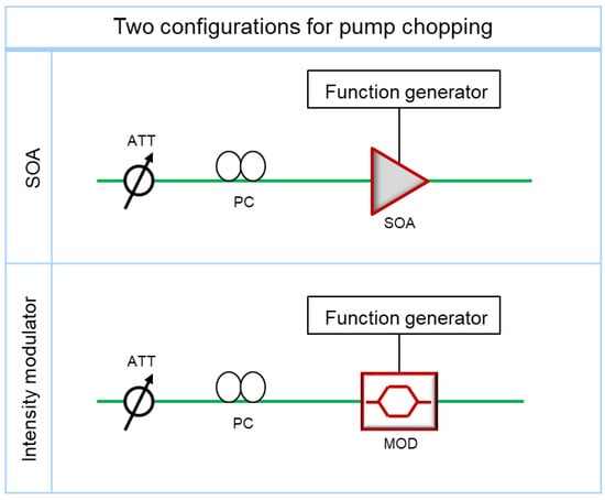 The measurement stability of the Brillouin frequency is one of the most important performances of a Brillouin sensor measurement system. The stability of the TD-BOCDA system was investigated, and experiments were conducted under two different pump light conditions. In the experiment of Figure 4, a semiconductor optical amplifier (SOA) was used as the pump chopper. Intensity lithium niobate modulators have been used as choppers in previous experiments, including ours [,]. Therefore, these two devices were compared in the TD-BOCDA sensor measurement system to detect the Brillouin scattering gain; their experimental configurations are illustrated in Figure 7. Before entering the chopper, the input power was regulated using a variable attenuator and a polarization controller for optimal input power adjustment. The chopper was operated using a function generator with a ~3 MHz sine function. The peak-to-peak and offset voltages for the electrical signals applied to the two comparison devices were found to be sensitive to the Brillouin gain and were optimized for the best performance in each configuration.