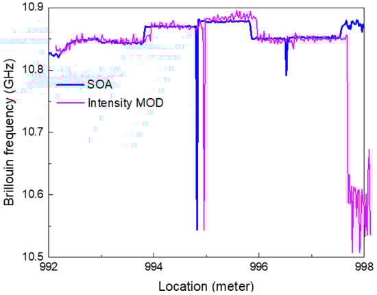 The Brillouin gain spectrum and Brillouin frequency were obtained when a MOD was applied to the TD-BOCDA sensor system. The results were compared with measurements obtained using an SOA. Figure 8 shows the Brillouin frequencies at the end area of 1 km in length, including the 2 cm DSF. Both measurements clearly indicate the location of the 2 cm DSF, and the two graphs are consistent with the detection location. The frequency graph with a MOD was intentionally shifted by 10 cm about the horizontal axis, representing the location for visual comparison with the graph with SOA. Both measurements accurately captured the locations of all different types of optical fibers. However, the measurement system employing a MOD exhibited relatively large frequency fluctuations in each fiber area.
