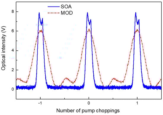 Time responses of the chopped pumps using an intensity modulator or SOA for comparison. The horizontal and vertical axes are in arbitrary time and relative voltage units, respectively.
