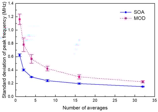 The stabilization of the Brillouin frequency measurement was evaluated for the TD-BOCDA sensor system using either an SOA or a MOD as the pump chopper, as shown in Figure 10. At a specific location of 997 m at the end of a 1 km distance, the Brillouin frequency detection was averaged over 1, 2, 4, 8, 16, and 32 times, and this averaged detection process was repeated 50 times. Figure 10 presents the standard deviations of the repeated averaged measurements. In the case of an SOA, the deviation was 0.62 MHz over fifty repeated measurements without the detection average. When the number of averages increased to 32, the standard deviation reduced to 0.15 MHz. This value corresponded to a strain of 3 με, considering a strain coefficient of 20 με/MHz []. When averaged over 32 runs, the Brillouin frequency deviation with the MOD increased by 50% compared with that with the SOA. The deviation increased by up to 100% compared with the case with the SOA without averaging. This suggests that using an SOA yields more accurate results for measuring the Brillouin frequency than using a MOD. The reason for this is estimated to be the better extinction ratio between pump-on/off compared with the case with an SOA. Compared with other Brillouin optical sensing measurement systems, the BOTDA method, which is a competing technology of BOCDA, exhibited a deviation of ~2 MHz [], while traditional BOCDA methods have shown deviations in the range of 1~2 MHz [,,]. As shown in Figure 10, under conditions without averaging, the experiment employing a MOD for pump chirping exhibited a deviation of 1.18 MHz, whereas that using an SOA exhibited a deviation of 0.62 MHz. This result demonstrates that the performance of TD-BOCDA is equivalent to or better than that of conventional BOCDAs in terms of measurement reliability. Simultaneously, TD-BOCDA is free from the drawbacks of conventional BOCDAs, such as the use of time-delayed optical fibers and varying bit rates.