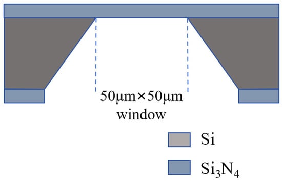 The Si3N4 membrane chip used for nanopore fabrication is a testing product provided by Shenzhen Jieyun Biotech Co., Ltd., Shenzhen, China, structurally similar to YWMEMS CleanSiN products. The structure of the Si3N4 membrane chip is illustrated in Figure 1, where a 15 nm thick silicon nitride film is positioned on the silicon support layer with a 50 μm × 50 μm window in the center. The specific manufacturing process is detailed as follows: a Si3N4 chip was clamped with the assistance of two rubber gaskets within the specially designed flowcell illustrated in Figure S2. The chip was securely fastened using screws. Ethanol was sequentially injected into the liquid chambers on both sides, ensuring the absence of residual air bubbles. Subsequently, the ethanol was drained, followed by several rinses with deionized water. Finally, the chip was washed multiple times with a 1 M KCl-TE solution (pH = 8). The KCl-TE solution was then introduced into both ends, preparing the chip for subsequent controlled dielectric breakdown pore formation operations.