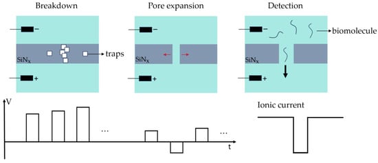 The nanopore fabrication process and the subsequent biomolecule detection process. The fabrication process is divided into two stages: high-voltage breakdown and low-voltage pore expansion. The detection process was based on the ion current blockade caused by the translocation of biomolecules.