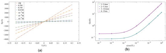 The Axon Digidata 1550B low-noise data acquisition system and Axopatch 200B patch-clamp amplifier (both manufactured by Molecular Devices, San Jose, CA, USA) were used to perform current characterization and the subsequent biomolecular detection of the fabricated silicon nitride nanopores. Following the fabrication of the Si3N4 nanopore, the chip was to be maintained within the flowcell, subsequently moved into a Faraday cage. Then the two Ag/AgCl electrodes situated in the respective chambers were to be connected to the Axopatch 200B patch-clamp. Utilizing the “Clampex10.4” software on the interconnected computer, the voltage applied to the chambers can be configured, and current readings can be acquired in correspondence to distinct voltage values. By changing the KCl concentrations and measuring the current at different voltages, a I–V curve for a fabricated nanopore under varying KCl solution concentrations was obtained. Subsequently, the conductance values of the nanopore at different KCl concentrations were derived from the I–V characteristics, enabling the construction of a relationship curve between nanopore conductance and KCl concentration.