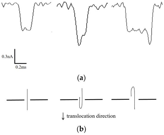 Individual translocation events were isolated for detailed analysis, as depicted in Figure 4a. Distinctive shapes of the current blockade waveform reflect different translocation postures of the DNA molecules. If the blockade signal exhibits symmetrical characteristics, it suggests that the DNA chains translocate through the nanopore in a predominantly linear fashion. Conversely, if the blockade signal waveform displays step-like features, it indicates varying degrees of folding during the DNA translocation. Figure 4b illustrates three potential DNA translocation configurations corresponding to the three waveform patterns observed in Figure 4a. Further consideration of the amplitude and translocation duration of individual blocking signals allows for a more refined analysis of the translocation dynamics of the DNA molecules.