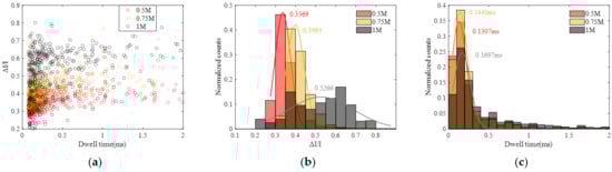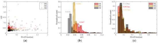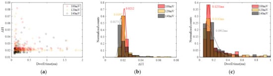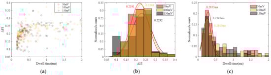 To analyze the distribution of current blockade amplitude and dwell time, the statistics of current blockade ratio (ΔI/I) and dwell time at 50 mV, 100 mV and 150 mV were calculated, as shown in Figure 6, and the statistics of the current blockade and dwell time are illustrated in Figure S3. Each distribution is fitted by a Gaussian curve. It can be seen that the peak current blockade increases as the voltage increases and the peak dwell time decreases as the voltage increases, while the difference in ΔI/I is not significant. As the voltage rises, the corresponding baseline current also increases, leading to larger current blockades caused by molecule occupation. Additionally, with increasing voltage, the force acting on DNA molecules due to the electric field becomes stronger, resulting in faster translocation and, consequently, a reduction in translocation time.