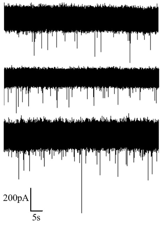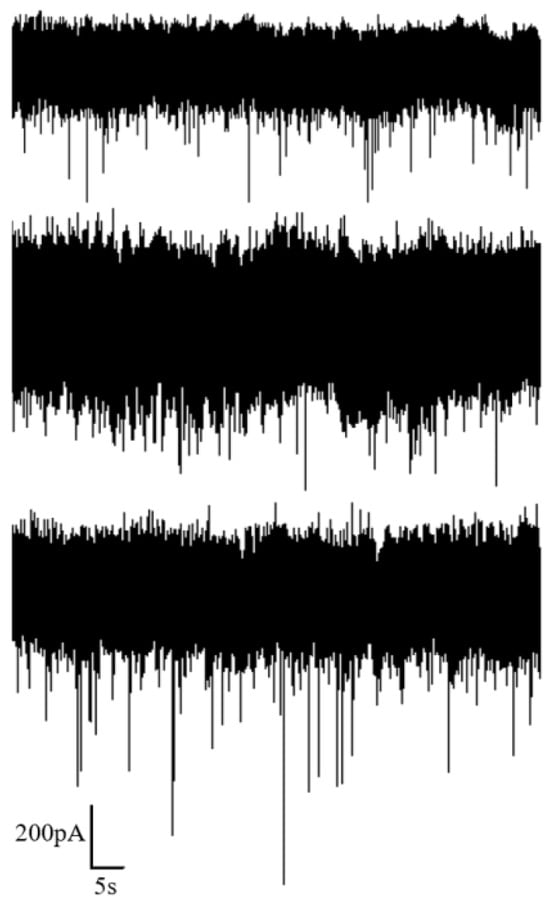 Ion current signal of protein detection under different voltages (100 mV, 120 mV, 140 mV from top to bottom).