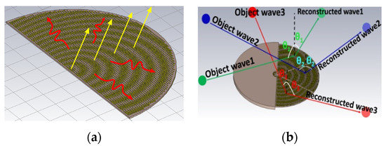 Originating from the field of optics, holography is a technology for recording an object’s optical information onto a plane called a hologram and the subsequent reproduction of its image when light passes through the plate, also known as an interferogram. This idea can also be extended to the microwave arena [4,5], such as applied to the design of LWAs in millimeter wave bands. During earlier times, there were two common types of holographic antennas [6], namely reflected type and transmitted types, although both of those suffer from large scattered wave losses. In recent years, researchers have begun to develop newer holographic antennas, the source and interferogram of which are on the same plane, thereby alleviating transmission losses and also reducing the volume of the entire system. This concept is illustrated in Figure 1a for an example of a semicircular hologram adequate for forward-directed beams, which depicts multiple beams simultaneously radiated from a single flat holographic LWA due to surface waves propagating along the artificial impedance surface (AIS) synthesized according to the interference patterns of various object waves bearing information of beam directions with known reference waves. Figure 1b schematizes the image reconstruction of an object comprising distributed sources achieved by a generic form of circularly shaped planar holographic LWA made of metallic patches printed on a grounded substrate.