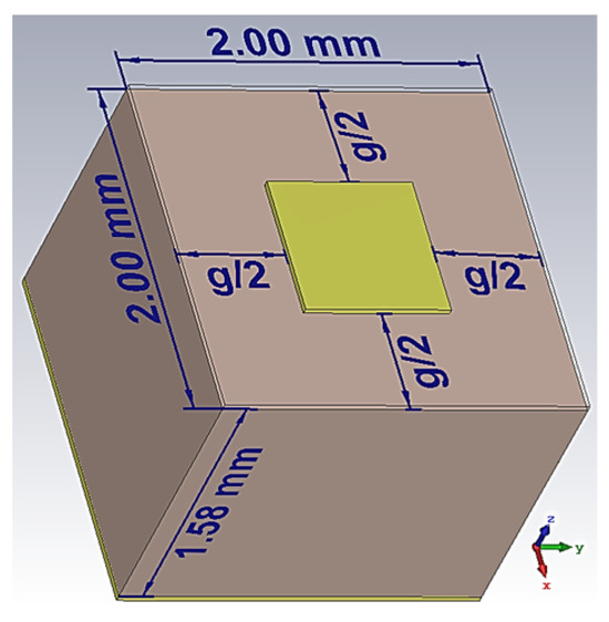 The holographic plane is composed of sub-wavelength metal square patches of various sizes printed on a grounded dielectric substrate. The wavelength λ at 28 GHz in free space is about 10.7 mm, and each unit cell should be less than λ/4 (2.67 mm). For convenience, a universal unit cell size of 2 mm is chosen. A substrate made of Rogers 5880 (dielectric constant εr = 2.2, loss tangent = 0.0009 and thickness 1.57 mm) was chosen for the design due to its low loss tangent that mitigates losses in the millimeter wave band. The unit cell has a square shape with a period of p = 2 mm. The structure is back-shielded by a copper sheet, and a metal patch is printed on the surface, as shown in Figure 2, with g denoting the gap size between adjacent patches.