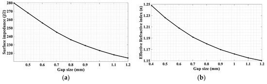 Since any one gap size leads to a distinct ks for any given frequency f (thus k0), each in the considered range of gap sizes, from 0.4 to 1.2 mm, pertains to a certain αz of (34) and thus Zpatch of (33). This allows us to numerically compute Zpatch versus the gap size, as shown in Figure 3a for f = 28 GHz, in which Zpatch ranges from j280 to j214 Ω. Therefore, X in (32) is obtained as X = (280 + 214)/2 = 247. Due to the sinusoidally oscillating nature of Zsurf in (32), we need a factor to expand X to a maximum value of 280 and a minimum of 214 so that the surface impedance of the unit cell can match the hologram. Hence, we set M = (280 − 247)/247 = 0.133. Again, due to different ks associated with different gap sizes, the variation of the refractive index n at f = 28 GHz with the gap size can be plotted as shown in Figure 3b.