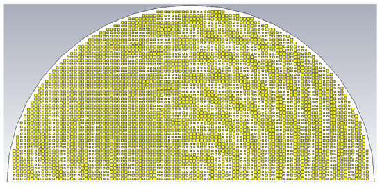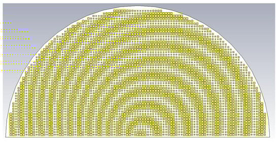 To verify the proposed formulation, the holographic antenna shown in Figure 4 was synthesized for two object beams of different incidence angles and polarizations using the above formula. The beam of the TM polarized object plane wave arrives from (θ0m = 20°, ϕ0m = 45°), while that of the TE polarization is from (θ0e = 50°, ϕ0e = 135°), both arbitrarily chosen directions. Equal amplitudes of both beams are assumed, i.e., ATM = ATE = 0.5.