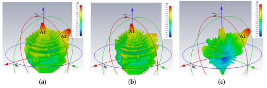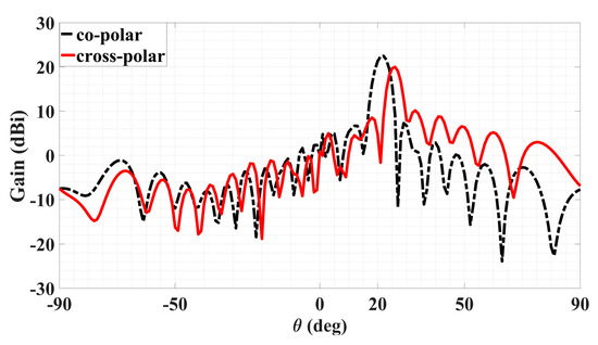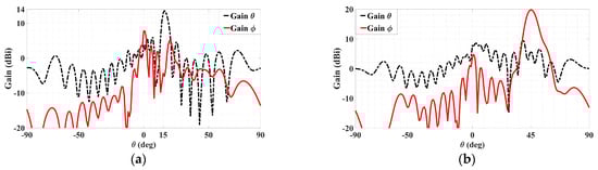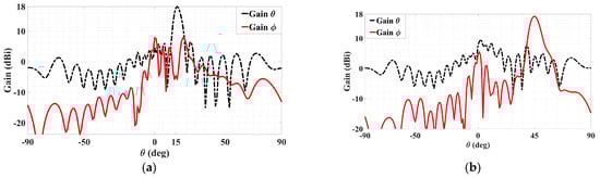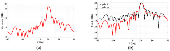 We proceed to the next case of two differently polarized beams, with ATM = 0.333, ATE = 0.667, the latter being double the former. The simulated gain patterns in the same fashion as Figure 6 and Figure 7 are presented respectively in Figure 8 and Figure 9. Particularly, the 3D patterns of the absolute gain, the theta, and phi gain components are conveyed by Figure 8a–c respectively, and the patterns in the two phi planes containing the intended beams of both polarizations are given in Figure 9a,b, in each of which the patterns of both the co- and cross-polar components are presented. Without describing the details again, the same as before about the co- and cross-polar components of both polarizations (TM and TE) being strongly and weakly radiated towards their designated beam directions can also be said here for this case. The theoretical difference of 20log10(2) = 6.02 dB between both beam levels is seen to be demonstrated by the amount which the maximum gain level of the phi component in Figure 9b, being about 20 dBi, is stronger than that of the theta component in Figure 9a, being about 14 dBi.
