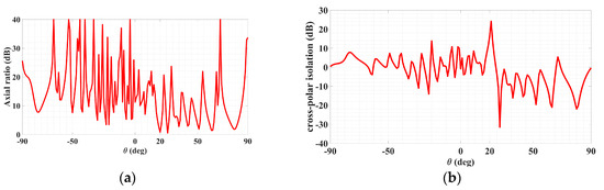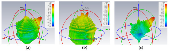 For a center frequency of 28 GHz, the 3D gain patterns of the far fields simulated by CST are presented in Figure 5. The absolute gain (regardless of polarization) is depicted by Figure 5a, in which beams towards those two directions are clearly produced. Extracting the co-polar theta component of the E-field for the TM mode, it is seen in Figure 5b that only a single beam towards its prescribed direction (θ0m = 20°, ϕ0m = 45°) is now portrayed, with the radiation of this component towards the other unintended direction (θ0e = 50°, ϕ0e = 135°) of the TE polarization remaining weak. Likewise but conversely, strong radiation of the co-polar phi component of the E-field towards just the designated direction (θ0e = 50°, ϕ0e = 135°) for the TE case is observed in Figure 5c. The cross-polar phi component of the TM radiation towards its desired beam direction (θ0m = 20°, ϕ0m = 45°) is seen from Figure 5c to be weak as well. Similarly, the cross-polar theta component of the TE case towards its intended (θ0e = 50°, ϕ0e = 135°) is shown in Figure 5b to be also suppressed, as required.