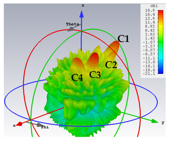 Simulated 3D radiation pattern of all-TM-polarized quadruple-beam holographic antenna for (ϕ0m,1 = 150°, ϕ0m,2 = 120°, ϕ0m,3 = 60°, ϕ0m,4 = 30°) and (θ0m,1 = θ0m,2 = θ0m,3 = θ0m,4 = 30°) with (A1TM = C1 = 0.2, A2TM = C2 = 0.15, A3TM = C3 = 0.4, A4TM = C4 = 0.25).