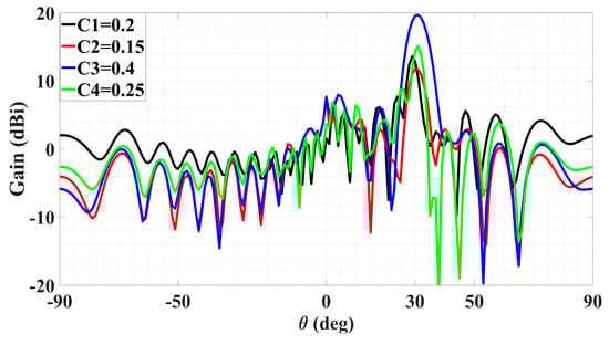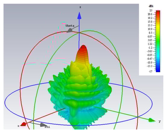 Presented in Figure 10 and Figure 11 are likewise the respective 3D and 2D gain patterns, with any one of the four traces in the latter being that of a certain beam-containing phi plane. With all beams sharing the same θ0m,i = 30° angle, it is more readily observed that the level differences among the gains indeed come to terms with the respective differences in their amplitude coefficients. For instance, the 4 dB drop from the peak gain (of about 19 dBi) of the beam with tailored strength of C3 = 0.4 to that (15 dBi) of the beam with C4 = 0.25 checks well with 20log10(0.4/0.25) = 4.08. The radiation and total efficiencies are εrad = –0.18 dB (96%) and εtot = –0.486 dB (89.4%), respectively.
