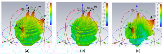 The 3D patterns are presented in Figure 12, of which Figure 12a–c convey the absolute gain, the theta, and phi gain components, respectively. Equal strengths of radiation towards all four beam directions are observed in the first subplot, as required. Once again, the co- and cross-polar components of both polarizations (TM and TE) are strongly and weakly radiated towards their designated beam directions, as Figure 12b,c show for the TM and TE beams, respectively.