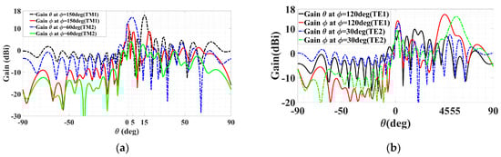 Planar plots of the patterns in the various phi cuts containing the four beams are presented in Figure 13. The two TM beams in the 150° and 60° phi planes are portrayed by Figure 13a, while the pair of TE ones in the 120° and 30° cuts are shown in Figure 13b. The theta and phi gain components are annotated in the legend of each subplot. Observed in Figure 13a for the TM beams are the radiations of strong co-polar theta but weak cross-polar phi gain components towards the two theta directions—θ0m,1 = 15° and θ0m,2 = 5° of both beams—whereas Figure 13b displays strongly and weakly radiated co-polar phi and cross-polar theta components towards θ0e,1 = 45° and θ0e,2 = 55°, respectively. Similar peak gains of about 16 dBi of the co-polar components are observed in Figure 13a,b, as expected of the equal prescribed amplitudes. For this case, the efficiencies are εrad = –0.174 dB (96%) and εtot = –0.4 dB (91%).