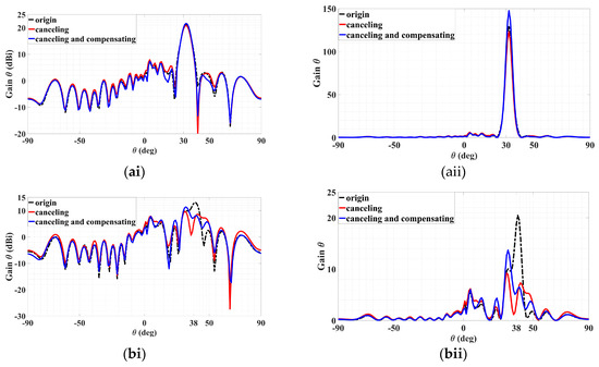 The above figure is a composite diagram of original, sidelobe cancellation, sidelobe cancellation, and main beam compensation and is divided into (a) main beam (TM) co-polarization; (ai) dB scale, (aii) linear scale, and (b) sidelobe TM co-polarization; (bi) dB scale, (bii) linear scale.