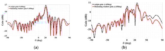 Starting with discussing the TM case, the co- and cross-polar radiation patterns (theta and phi gain components) are presented in Figure 20a,b below, in each of which the solid red line is for the original pattern before the Hamming window and the black dotted trace conveys the pattern upon the implementation of the Hamming window function stated above. It can be seen from Figure 20a that even though the co-polar main beams decrease by about 1.5 dB, the nearest-in co-polar sidelobe levels towards θ greater than the main beam’s 20° are observed to have slightly fallen. Howevcer, it is not these co-polar sidelobes, which are all at most about only 5 dBi, but rather the cross-polar ones that were originally serious at levels exceeding 10 dBi and thus in more crucial need of being alleviated. This is seen from the cross-polar pattern of Figure 20b, in which the most severe cross-polar sidelobe level of about 10.57 dBi towards (ϕTM,SL = 45°, θTM,SL = 25°) prior to Hamming window is seen to be mitigated to about 8.47 dBi upon the Hamming window, which shows a significant reduction of about 2.1 dB. Substantial mitigation towards most other theta directions about that 25° is also observable, even by as much as 6.8 dB towards θ = 17°. Although the sidelobe levels towards θ = 45° deteriorate, significant improvement towards most other theta directions of approximately 50°–90° is also distinct.