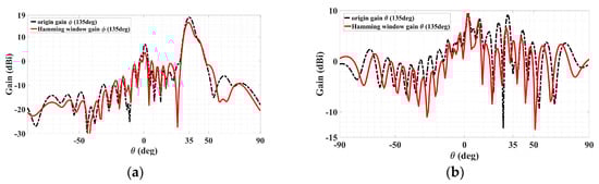 Coming to the TE polarization, the co- and cross-polar radiation patterns (phi and theta gain components, respectively) are presented in Figure 21a,b, with co-polar main beam directions toward (ϕTE = 135°, θTE = 35°), as conveyed by the former plot. The same explanations of the solid red and dotted black lines previously for the TM case reapply here for the TE case, being traces prior to and upon the Hamming window respectively. Before and after Hamming window, the co-polar main beam levels are 18.12 dBi and 16 dBi, respectively. In the Hamming window, the nearest-in sidelobe levels of the co-polar pattern are observed to have fallen by about 28 dB. For the cross-polar pattern of Figure 21b, substantial mitigation towards most theta directions is easily observable, and the cross-polar pattern with the most severe sidelobe towards (ϕTM,SL = 135°, θTM,SL = 30°) was reduced by about 2.64 dB. Additionally, the second most severe sidelobe towards (ϕTM,SL = 135°, θTM,SL = 25°) reduced by about 5.2 dB. It can thus be seen that using the Hamming window can mitigate most sidelobe levels so that the minor reduction of the co-polar main beam can be neglected.