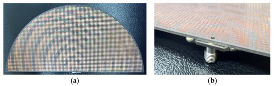 As per the simulations in the previous section, the manufactured antenna uses a Rogers 5880 PCB board, the top side and SMA soldering of which are photographed in Figure 23a,b, respectively. The 2.92 mm panel jack connector, with an operation frequency from 18 GHz to 40 GHz that encompasses our 28 GHz, was welded onto the underside ground plane, as the photo of Figure 23b shows, and its inner copper pin tunnels through the board to protrude vertically out on the other (upper) side.