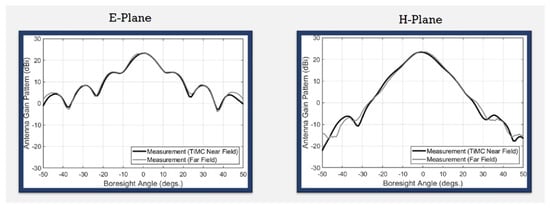 We used the antenna measurement platform (model SB10110-45) developed by the company, Taiwan Microwave Circuit Co., Ltd., located at 3F., No. 72, Chenggong 10th St., Zhubei City, Hsinchu County 302050, Taiwan (R.O.C.), to measure the antenna radiation field pattern. The technology used by the company’s antenna measurement machine is near-field measurement technology combined with the algorithm developed by the company to obtain far-field data for generating antenna patterns. Radiation patterns of a WR-28 standard [31] gain horn measured by this equipment have also been compared with those from external antenna measurements using far-field technology, as shown in Figure 24. Good agreement with traditional far-field measurements is observed.