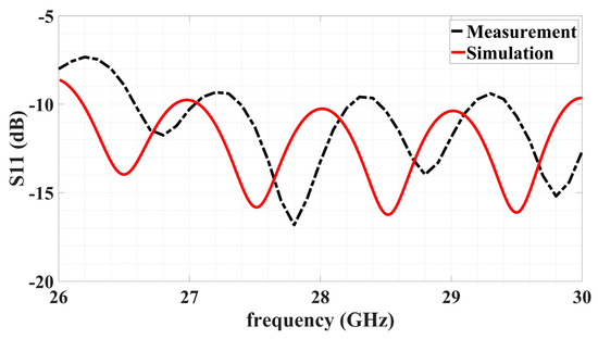 The simulated and measured reflection coefficients S11 over a band about the operation frequency is conveyed by Figure 26. Good impedance matching throughout the band centered at 28 GHz achieved by the simulated design is verified experimentally.