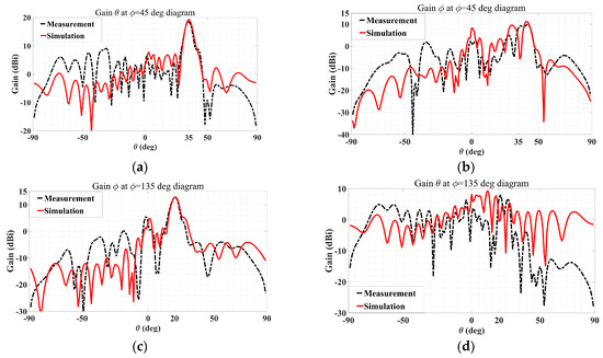 Shown in Figure 27 are the simulated and measured co- and cross-polar gain patterns of the manufactured holographic antenna that radiates two beams with mutually orthogonal polarization. It can be seen from Figure 27a that the simulated and measured co-polar gain (theta component) patterns of the TM polarized beam agree well with each other, with a maximum level of radiation achieved accurately towards the prescribed main beam direction of (θ0m = 35°, ϕ0m = 45°) of nearly 20 dBi for both. The corresponding patterns (simulated and measured patterns) of the cross-polar (phi) component towards that main beam direction are seen from Figure 27b to be indeed much lower than the co-polar intensity by around 10 dB. For the other beam, which is TE polarized, the consistency between the measured and simulated co-polar gain patterns (phi component) is evident from Figure 27c, while the agreements of the cross-polar (theta) pattern are observed in Figure 27d. The co-polar main beam level of around 12 dBi is accurately reproduced in the experiment towards the designated direction of θ0e = 20° and ϕ0e = 135° and is considerably stronger than the cross-polar level of about 0 dBi. In addition, the difference of about 6 dB between the intensities of the two measured co-polar main beams is also consistent with expectation by theory.