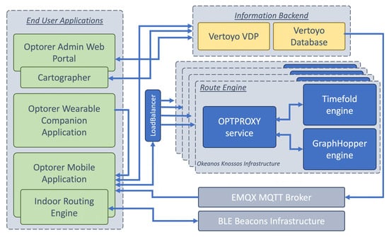 - The “Development subsystem”, or in other words the Information Backend, consists of two main tools (i.e., Vertoyo VDP and Vertoyo Database) that incorporate and deliver the actions and operations described in Section 3 for this subsystem. In more detail, Vertoyo Digital Platform (or Vertoyo VDP) is a platform based on the Java programming language that can be used to support complex web portals and mobile applications through a variety of ready-to-use features such as managing user roles/privileges and entity management/registration. It comes with advanced support functions, management of business workflows (Business Process Management-BPM), task scheduling, can be easily interfaced with Push/Email notification services, as well as with third-party systems, exposing or consuming programming interfaces such as REST or SOAP APIs. VDP communicates directly with the Vertoyo Database tool, a PostgreSQL DB that implements a custom SQL schema to store data for: (a) User Management-encrypted data for sensitive fields, (b) Content Management—static content of the Web application (e.g., PoI or AoIs), (c) Custom Entities Management—supporting data encryption. It is used to store the alerts coming from the MQTT pub-sub broker in OPTORER.The two tools inside the Development subsystem communicate with the web and mobile applications in the User Applications subsystem to give access to the back end to the certified users, and with the MQTT broker in the Infrastructure subsystem to receive updates that need to be stored in the system.