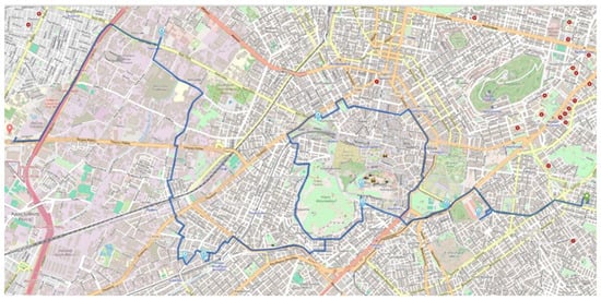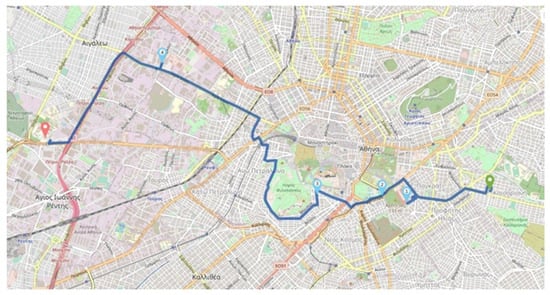 Trial tour used in our evaluation and visualization of the solution to the routing problem as a road route located in Athens, Greece.