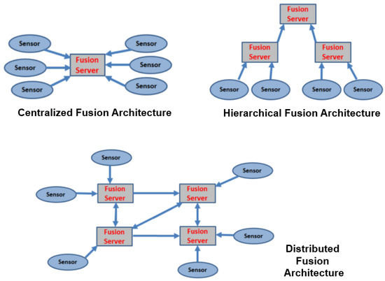 Centralized, hierarchical, and distributed fusion architecture.