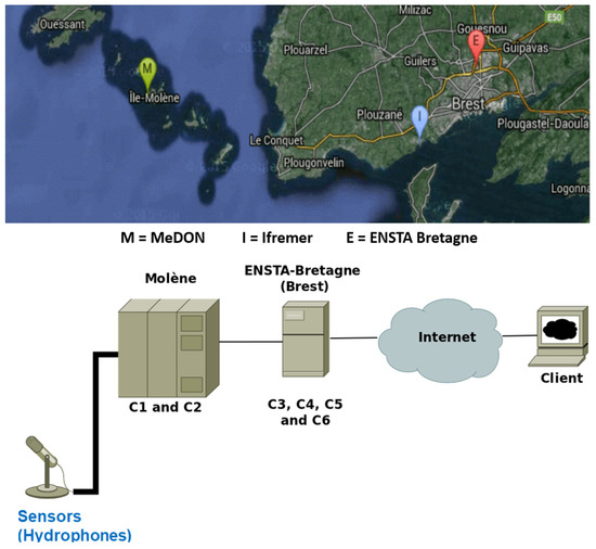 Future big data collecting systems will be developed using Underwater Smart Sensor Networks with a focus on environmental data acquisition [13,37,38]. They enable the interchange and processing of data between the various devices (e.g., Smart Fusion Servers, Smart Sensors). We can install software components on all of these devices to handle and store the data and information. As long as the network is functioning properly, these components can provide new features or services such as the localization of marine mammals or underwater moving objects as the Marine e-Data Observatory Network (MeDON) project (Figure 2), which provides an example of a Marine Observatories (MOs). To provide such services, SSNs ought to consist of a network of specialized heterogeneous devices and communications infrastructure that can record and monitor data at different locations with varying levels of computational and communication capabilities with different communication protocols.