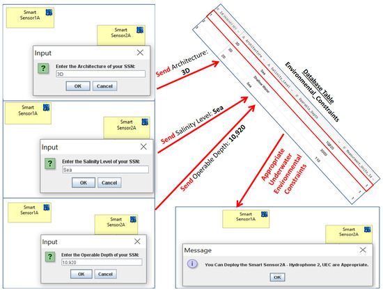 In order to validate this, the newly added UECs and their appropriate functioning are being used in the following manner while creating a MO model: upon tapping the SS icon inside the ArchiMO palette, our extended ArchiMO design tool leverages the AI Database to retrieve pertinent UEC values and the associated constraints of the selected SS, contingent upon a legitimate primary key that the designers must designate. In order to check and compare the input UEC values with the retrieved values from the AI Database, ArchiMO now asks the SSN designer to enter the correct architecture, salinity level, and operational depth for the intended SS. The SSN designer will now receive confirmation from the framework that he can deploy the Smart Sensor if he performs one of the following two scenarios (Figure 9): (Architecture: 3D, Salinity Level: Sea, Operable Depth: 10,920) or (Architecture: 2D, Salinity Level: Sea, Operable Depth: 110). In contrast, the SSN designer will be notified that one or more incorrect UEC prevents him from deploying the Smart Sensor (Figure 10). As a result, these constraints stop the SSN designers from entering an incorrect UEC for Fixed Nodes, SS, or SFS.