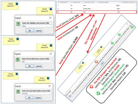 To visualize and have a graphical view for the added UECs, we utilized the generated version of ArchiMO during the creation of an MO model. This design tool helps the designer to model the information system in a highly abstract way by dragging and dropping the elements (e.g., Smart Sensors) and relations from the palette. The potential to employ the newly added UECs and their proper operation is verified during model editing in the following way: when a designer taps the SS icon in the ArchiMO palette, our extended ArchiMO design tool uses the AI Database to extract the relevant UEC’ values and the targeted SS’s accompanying constraints according to a valid primary key that should be assigned by the designers. At this stage, ArchiMO continues asking the SSN designer to enter the right primary key of the targeted SS and then the right architecture, salinity level, and operable depth in order to compare and verify the entered values of UEC with the retrieved values from the AI Database. At this point, if the SSN designer executes one of the next two scenarios, he will obtain confirmation from the framework that he can deploy the Smart Sensor (Figure 9): (architecture: 3D, salinity level: sea, and operable depth: 10,920) or (architecture: 2D, salinity level: sea, and operable depth: 110). In the opposite scenario, as seen in (Figure 10), the SSN designer will be informed that he is unable to deploy the Smart Sensor due to one or more improper UEC. Consequently, these constraints prevent the SSN designers from inputting the improper UEC for SSs/SFs/Fixed Nodes.