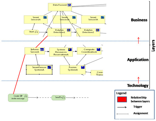 Application view from the underwater object (dolphin) localization model [16]—ArchiMate Application Layer.
