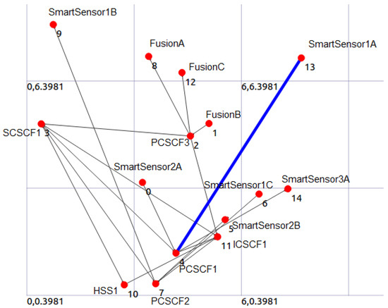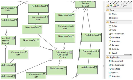 In the context of technology, we have extended the ArchiMO tool in [21,26] by utilizing the IMS meta-model and ArchiMate. IMS standards are mostly considered and contained in this extension [54]. After the simulation program is executed, the NS-3 simulator creates an animation script. The NetAnim tool imports this script to display the simulation scenario’s animation (see to Section 6.4, which depicts the messages that are transmitted and received between the various nodes. The transparency of our model transformation methods is demonstrated by the produced topology and by watching the message exchanges between the various nodes.