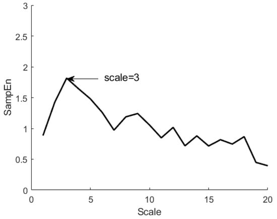 where m is the length of the repetition vector, r is the similarity criterion, N is the length of ACC data, and is the correlation sum. In this study, m and r were set to 2 and 0.2, respectively []. Figure 1 shows the MSE curves generated by plotting sample entropy as a function of the timescale based on hand tremor data. A peak can be observed when the score equals 3. MSE was calculated as the area under the MSE curve as follows [,]: