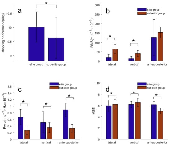 Scores of elite group and sub-elite group (a). The amplitude of hand tremors between the elite group and the sub-elite group (b). The peak powers of hand tremors between the elite group and the sub-elite group (c). The complexity of hand tremors between the elite group and the sub-elite group (d). * Significant tremor amplitude difference between elite group and sub-elite group: p < 0.05.