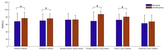 Furthermore, the sub-elite group participants demonstrated higher muscle activation in the anterior deltoid, posterior deltoid, triceps brachii (long head), and flexor carpi radialis compared with the elite group (p < 0.05, Figure 3).