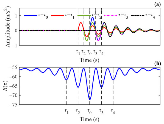 Since the object to be optimized is the surrogate function, it is not necessary to find the optimal solution that minimizes Equation (13), but only to search for a suboptimal estimate that decreases the surrogate function. Therefore, such a new estimate for can be readily obtained by using the gradient descent method. It should be noted that the waveform of transient signals is characterized by periodic oscillation and thus does not decrease monotonically as approaches the true value. Assuming that a certain impulse of the bearing fault signal occurs at the moment , when it turns to optimize the corresponding element of the vector , a local minimum of can be obtained if and only if is a multiple of half the oscillation period away from . An example is given in Figure 1a, which shows the least squares fitting results of the impulse using the Laplace wavelet, with the interval between and being different multiples of half the oscillation period. Figure 1b shows the trend of varying with near . Generally, it is very difficult to find the global minimum of a function with many extreme points because it is likely to be trapped in a local minimum and thus end the iteration. Fortunately, oscillates with a specific period, namely . With this feature, by comparing the values of at adjacent positions with the interval being different multiples of after each optimization of the gradient descent method, the position that attains the minimum can be set as a new estimate for this round of iteration. Such an optimization process ensures that gradually converges to the global optimal solution. In other words, as long as a local optimal solution is found, a global optimal solution can be found. Therefore, a new estimate is obtained by solving Equation (13) with the method above, and the update process for each time index is as follows: