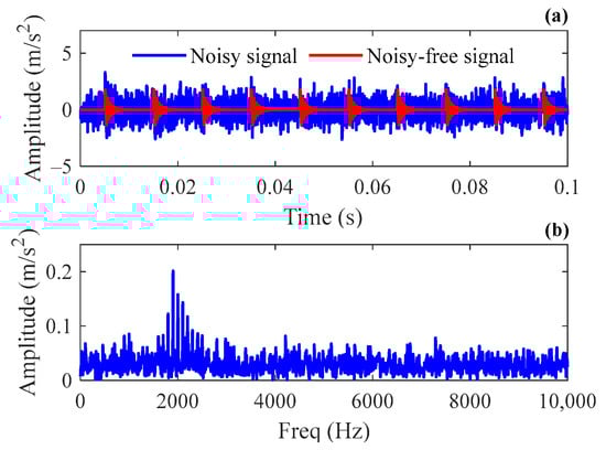 where amplitude parameter , damping ratio , natural frequency Hz, time index s, and failure period s. The sampling rate is 25,600 Hz, and the signal length is 0.1 s. The noise interference complies with the Gaussian distribution with the standard deviation and the SNR of the simulation signal can be calculated to be −8.21 dB. Figure 2 shows the graphs of the simulation signal in the time domain and frequency domain. It can be seen that the transient component is almost submerged in background noise. To construct the sparse dictionary, the correlation filtering method is adopted to estimate the parameters and of Laplace wavelet, and the results and Hz are consistent with the preset values in the simulation.
