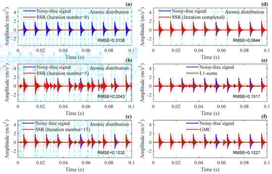 Results of repetitive transients extracted by different methods: (a–d) the SSR at different iterations; (e) the L1 norm; (f) the GMC.