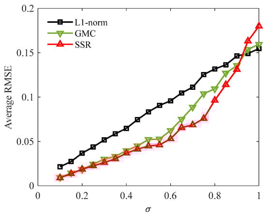 To further validate the stability of the SSR method, Monte-Carlo simulations are carried out to explore the signal reconstruction performance under different noise levels. is changed from 0.1 to 1 (with augment 0.05), and the average RMSE at each noise level is calculated from twenty repeated experiments. The results of the three methods are shown in Figure 5, where the SSR method achieves the lowest average RMSE under the condition of no more than 0.9. Besides, as the noise level increases, the advantage of the SSR method over the other two methods can be observed to increase first and then decrease. This is because it is not difficult to obtain ideal sparsity and data fidelity simultaneously when the noise is small, but with the increase in noise, the tradeoff between sparsity and fitting accuracy becomes increasingly tricky, which makes it more difficult to accurately reconstruct signals. Consequently, the improvement obtained through overcoming this problem becomes gradually remarkable as the noise increases. However, if the noise is large to a certain extent, some atoms may fail to converge to the right positions in the sparsity-enhanced optimization stage; thus, the existing error will be further amplified in the subsequent fidelity-enhanced optimization stage. All in all, the simulation analysis demonstrates that the SSR is a promising method that can render higher signal reconstruction accuracy than other sparse regularization methods in most noise conditions.