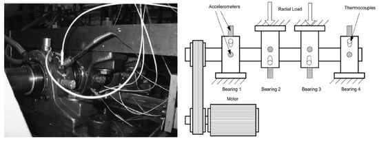 The data in the first case is the bearing life-cycle dataset from the University of Cincinnati. Figure 6 displays the layout of the bearing test rig, where the shaft is driven by an AC motor rotating at a constant speed of 2000 rpm and coupled by rub belts. Four rolling bearings are installed on the shaft and carry a radial load of 6000 lbs. The sampling frequency is 20.48 kHz, and vibration data were collected every 10 min to generate a segment of 20,480 samples. The dataset consists of a total of 984 files. After 163.8 h of operation, an outer race defect was observed on bearing 1. The bearing designation is ZA-2115, and the fault characteristic coefficient for the outer race is 7.09. Therefore, the fault characteristic frequency can be obtained by multiplying the rotational speed by the fault characteristic coefficient, with its value being Hz. For more details about this experiment, refer to Ref. [].
