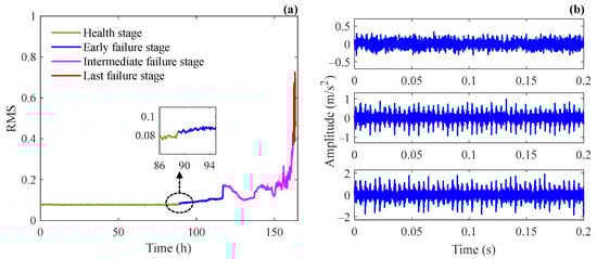 (a) RMS of the bearing life-cycle data in Case 1 and (b) vibration signals in different stages: early failure stage (upper), intermediate failure stage (middle), and last failure stage (lower).
